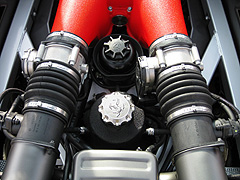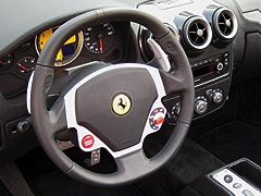 Beim F430 Spider kommen Technik und Know How aus dem Formel 1 Rennsport wieder direkt zusammen - und das vereint in einem offenen Spider. Die atemberaubende Zeit von 4s aus dem Stand bis zur 100 km/h Marke kommen also nicht von ungefähr, sondern resultieren aus gemachten Erfahrungen mit Motoren, deren PS Zahl sich um die 800 bewegt. Daher auch technische Neuerungen im Bau des Motores, der sich in den Grundzügen mit dem F360 vergleichen lässt, aber durch den Formel 1 Rennsport hinsichtlich seiner Leistungsfähigkeit um 25% gesteigert wurde. Jedoch dies mit einer Gewichtszunahme von lediglich 4 kg. Der F430 erscheint auf der Strasse als mächtige Persönlichkeit, dessen Charakter durch zwei grosse Lufteinlässe im Frontbereich unterstrichen wird. Seinen kompakten Baumaßen entsprechend wirkt er wesentlich "bulliger" als sein inspirativer Vorgänger F156 aus dem Jahre 1961, der im selben Jahr mit Phil Hill den Fahrertitel in der Weltmeisterschaft gewann. Die beiden grossen seitlichen Lufteinlässe betonen mit den Standard 19 Zoll Leichtmetallfelgen den eleganten, aber aggressiven Typ F430. Vervollständigt wird diese Erscheinung vom Heck, das stark an das derzeitige Topmodel Enzo angelehnt ist. Ferrari hat mit einem meisterlichen Verständniss von Kunstwerk und Stil gepaart mit den Eigenschaften, die man an einen echten Sportwagen stellt, ein innovatives Dogma erschaffen das man in jeder Einzelheit in Form und Wahl der Materialien wiederfindet.